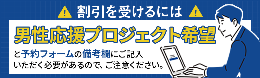 • ※予約フォームの備考欄に「男性応援プロジェクト希望」とご記入ください。