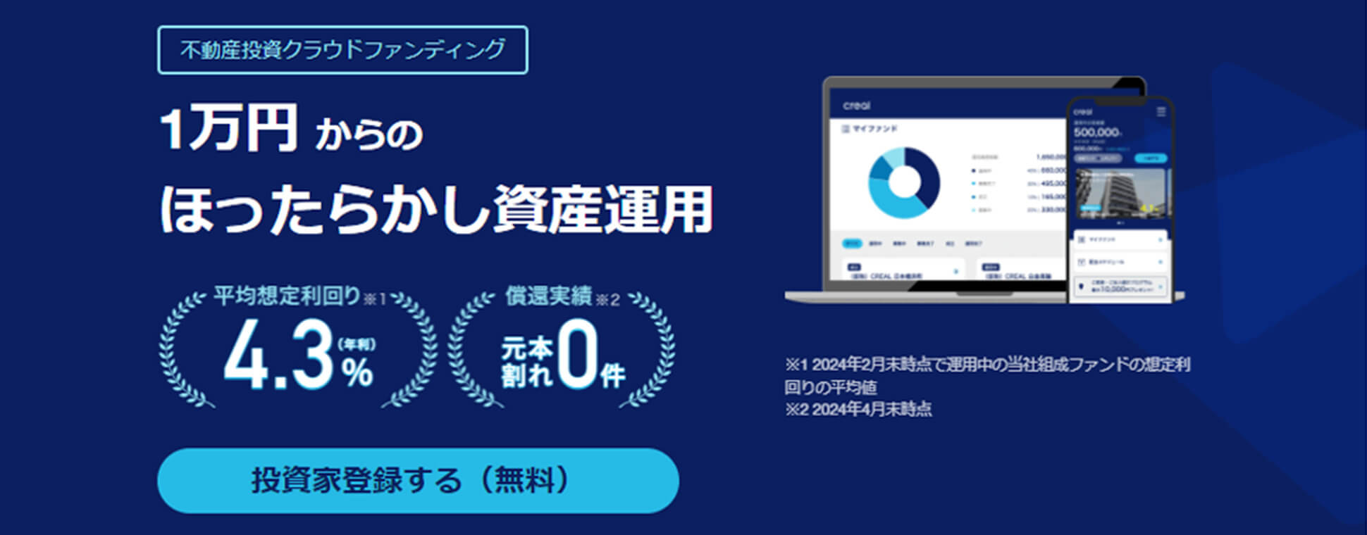 CREALは煩わしい契約実務や不動産管理をインターネットで簡略化し、手間なく資産運用を始めることが可能。ネット完結・最短1営業日で口座開設も可能で、手軽さが人気。