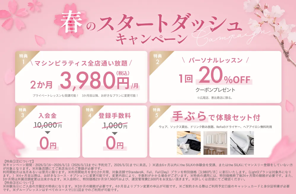 the SILKでは経験豊富なインストラクターが丁寧にサポートしながら50分の無料体験レッスンを受けることができます。レンタルウェア、滑り止め靴下、タオル、ウォーターサーバー飲み放題の「手ぶら体験セット」がついているので気軽に体験レッスンが受けられます。体験レッスン後は約30分のカウンセリングつきで一人ひとりにあったレッスンを提案してくれます。無理な勧誘はありませんのでご安心ください。the SILKのマシンピラティスが気になる方はぜひこの機会に無料体験レッスンのご予約をおすすめします!