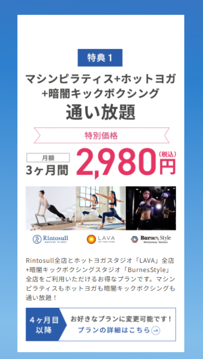 かなりお得なキャンペーン中で3ヶ月間1,980円(税込)でマシンピラティス+ホットヨガ+暗闇キックボクシング通い放題!入会金、登録料0円なので入会するならRintosullが本当におすすめです!