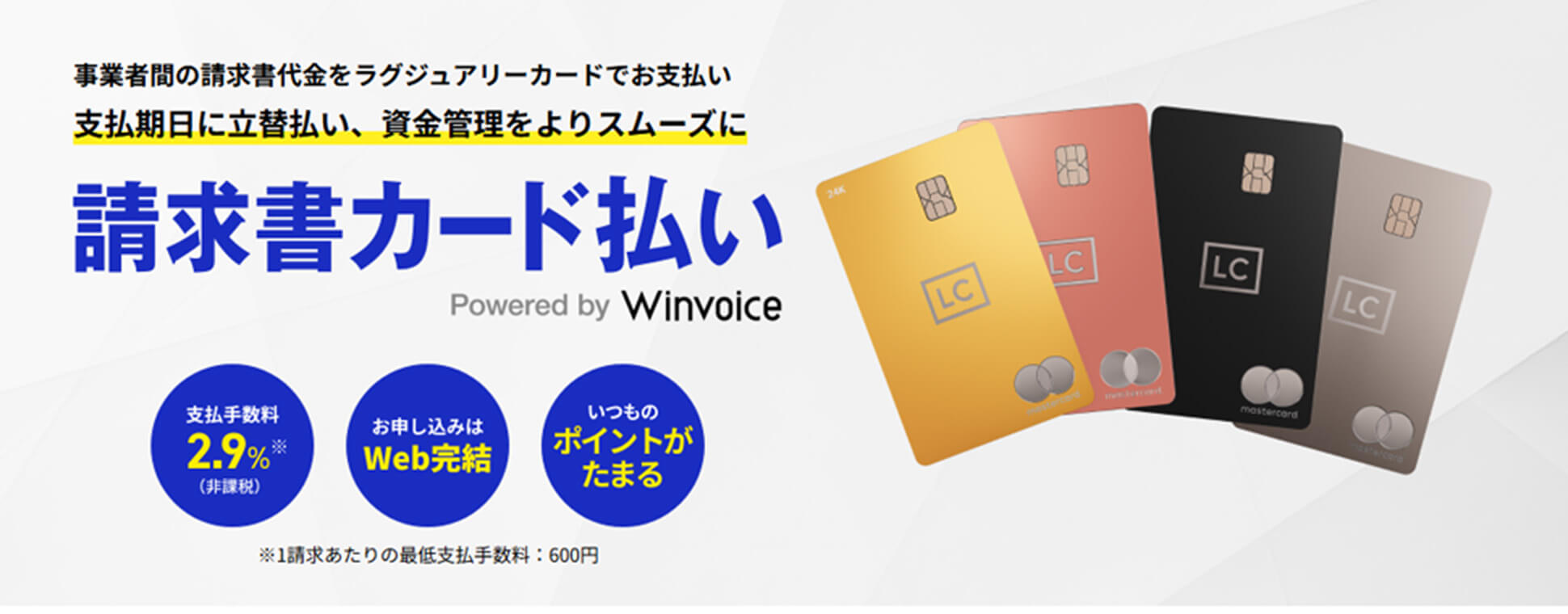 「請求書カード払い Powered by Winvoice」はラグジュアリーカード※のポイント進呈対象のサービスです。カードの種類によって異なりますが、最大1.5%のポイント還元。おトクに請求書のお支払が可能。手数料も2.9%と業界最安水準。初期費用・月額費用も無料。