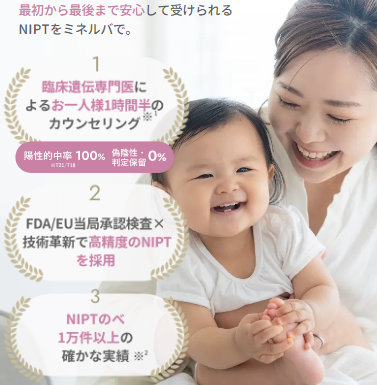 ミネルバクリニックは、日本で数少ない「遺伝子専門医」が院長を務めるNIPT専門クリニックです! オンライン診療が可能なため、全国どこからでも専門医による質の高いNIPTを受けることができます。 特に、全染色体や微小欠失症候群といった、より詳細な検査に対応している点が大きな強みです。 検体は国内で解析されるため、海外への輸送による不安もありません。 自宅でリラックスしてカウンセリングを受けたい方や、詳細な検査を希望する方におすすめなクリニックです!