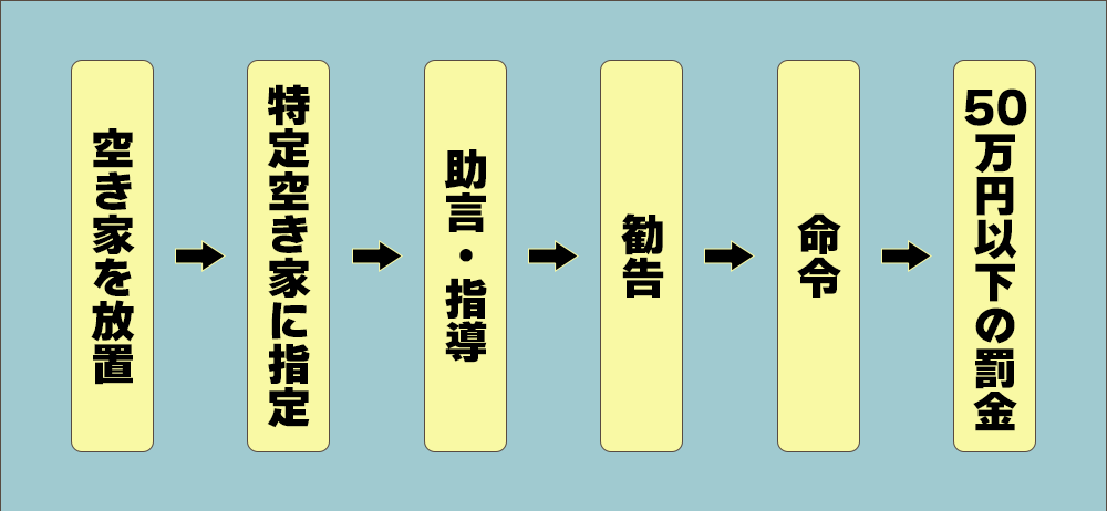 - 命令:勧告に従わない所有者に対して改善命令を出し、命令に従わない場合50万円以下の罰金