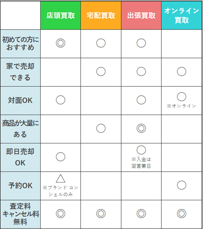 | 店頭買取・宅配買取・出張買取・オンライン買取・LINE査定 | 査定・買取に係る費用無料 (査定・送料(宅配買取)・出張費(出張買取)・振込手数料など) |