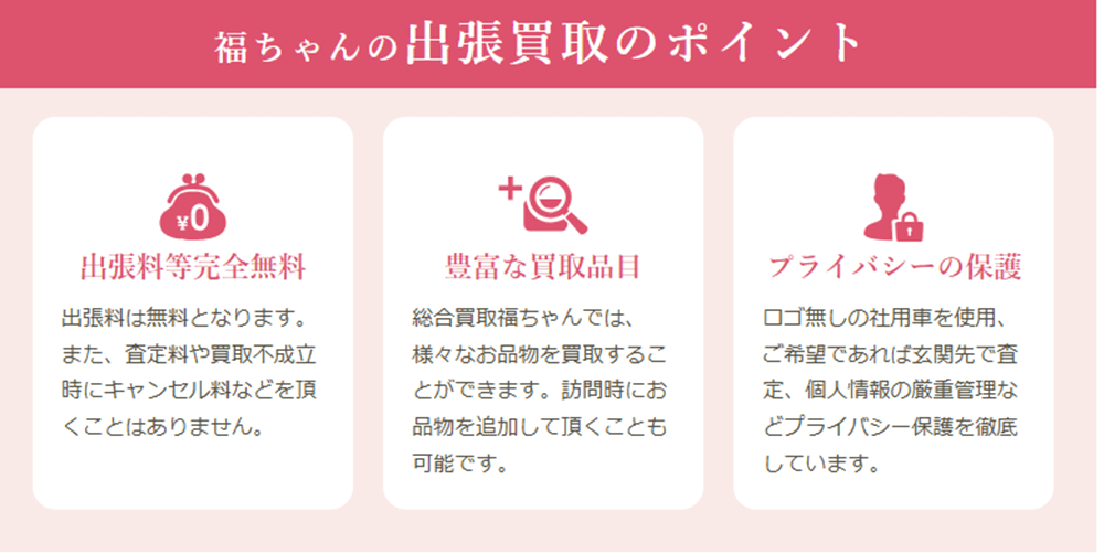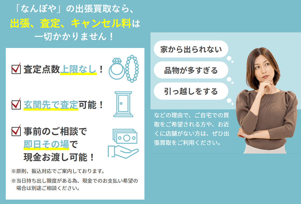 査定してほしいものが大量にあり直接査定してほしい、でも持ち運んだり宅配するには気が引ける場合は出張買取をお選びください。