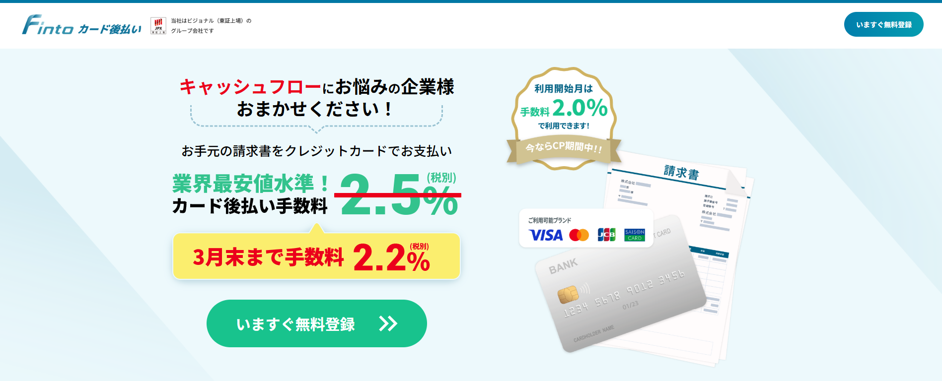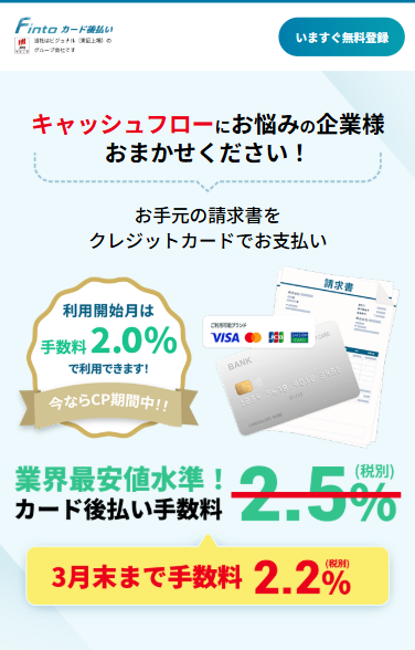 Fintoカード後払いは東証プライム上場ビジョナルグループ会社が運営する請求書カード払いサービス。