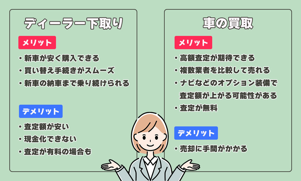 ディーラーで下取りしてもらうのは手続きの手間が省けて楽ですが、あくまでサービスの一環ですので金額は低くなりがち。
