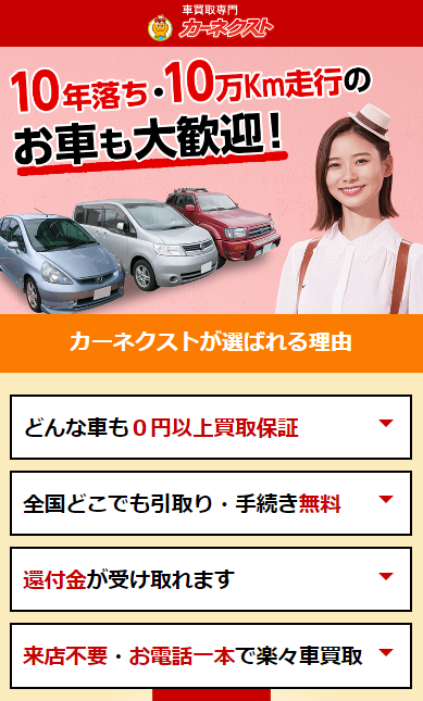 買取業者によっては状態の悪い車だと買取できないと言われてしまう場合もありますが、カーネクストならどんなに状態の悪い車でも0円以上での買い取りが可能なので、一度査定をしてみるといいかと思います!