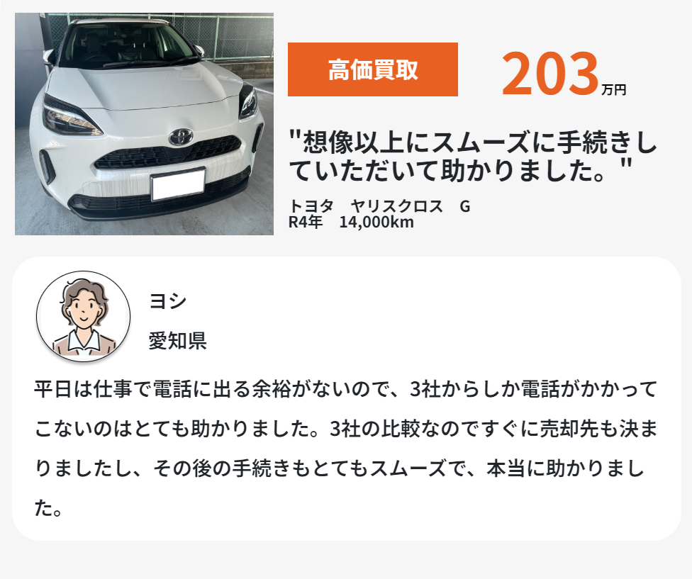 | ・茨城県 30代/男性 一気に最高の査定額が出せるので、とても便利。しかもとても早いので大満足です。 ・神奈川県 30代/男性 数社からすぐにアポイントの連絡がありその場でおおよその買取金額の提示がありとても良かった。 ・長野県 40代/男性 ディーラー査定との差額が75万円あり、今でも信じられません。一括査定を知らないのは、ある意味人生を無駄にしてしまっているかも、と思います。 ・秋田県 50代/男性 廃車するしかないと思っていた車でしたが、思ってもみない金額で契約でき大満足です。このお金で家族で旅行しようと計画しています! |