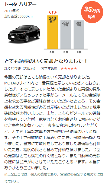 また、「実車を見ないとわからない」と言われる会社も多いですが、MOTAは申し込んだ翌日18時に概算査定額がWEB上に表示されます。(※一部対象外の場合がございます)