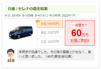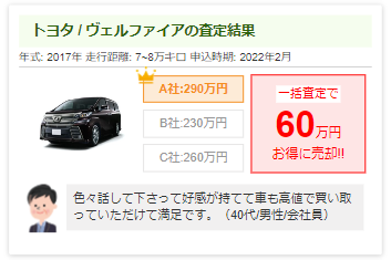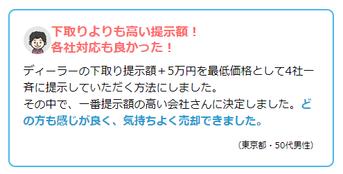 - ※一括査定サービスは競争原理が働き、査定額が高くなりやすい傾向があります。