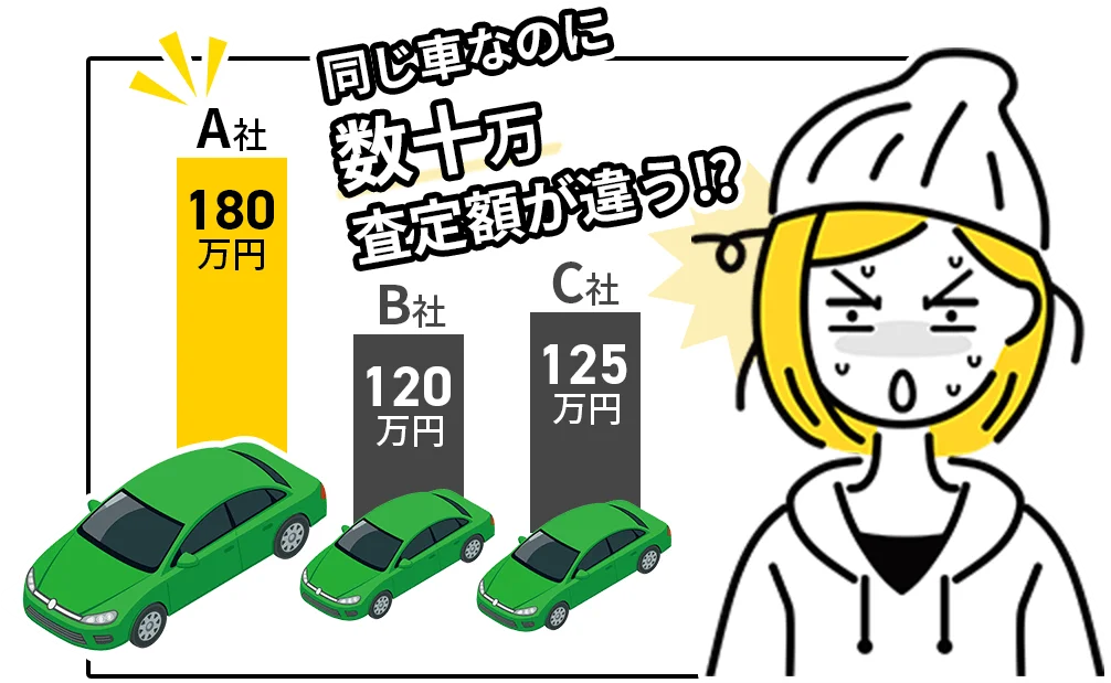 車の買取価格は、査定をする業者によって、同じ車種・同じ状態でも数十万円以上の差がつく場合も多く、査定額の比較は必須です。