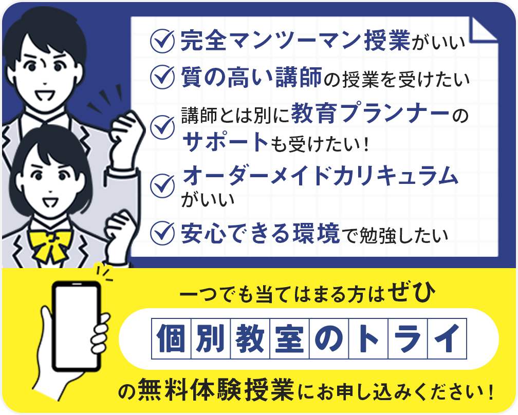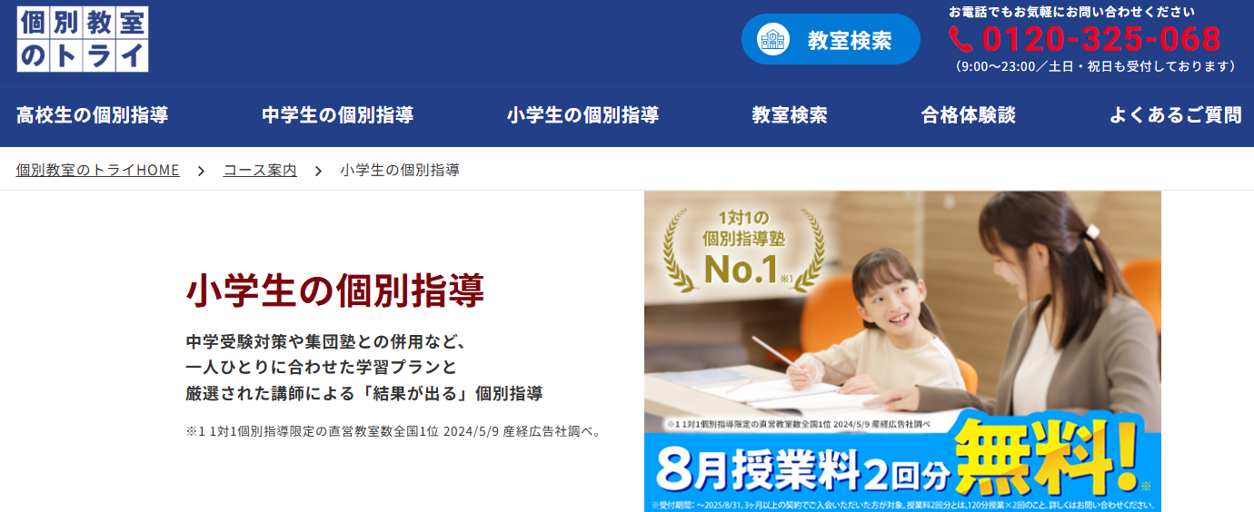また、受験対策や小中高一貫校対策、定期テスト対策、学校別特化対策、英検や漢検対策など様々なニーズに対応可能となっているのが個別教室のトライです!