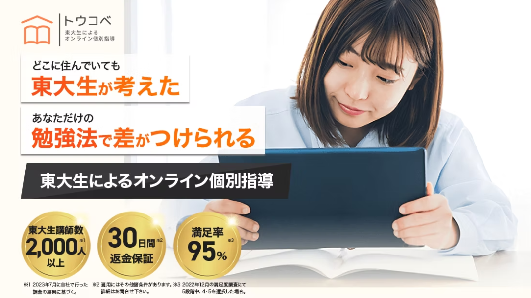 | ・オンライン形式のみ | 30日間返金保証つきで安心 (適用にはその他諸条件があります) 東大生が考える一人ひとりに合った勉強法! |