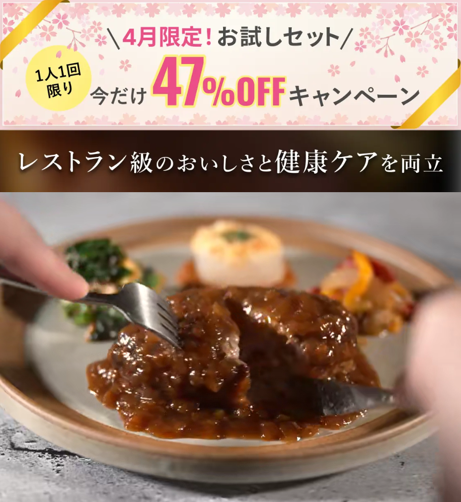 | 567円/食(税込)~ 初回2,300円割引キャンペーン価格 いつでもキャンセル・解約OK |