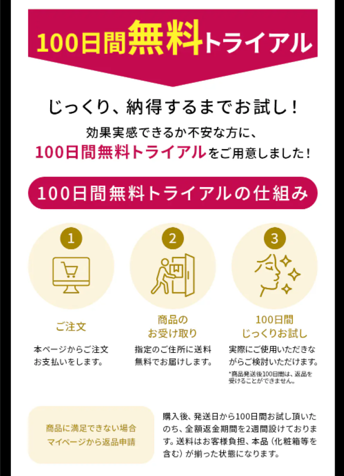 ※1:ご購入後、発送日から100日間お試し頂いた方に限り、全額返金期間を2週間設けています。詳細条件あり
