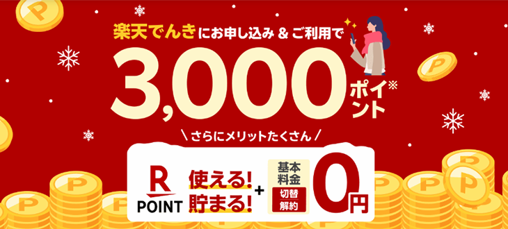 | 電気代節約しながら楽天ポイントがザクザク貯まる | クレジットカード、楽天ポイント | ・新規申込&ご利用で楽天ポイントが3,000p貯まる (2025年9月2日(水) 9:59まで) ・利用料金200円につき楽天ポイントが1p貯まる (でんき+ガスなら100円につき1p) ・楽天カードで支払えば楽天ポイントが100円で1p貯まる ・楽天市場での買い物で楽天ポイント+0.5倍 |
