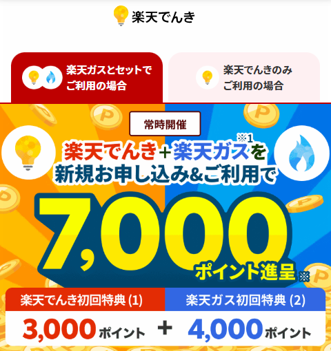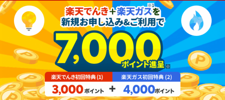 | 電気代節約しながら楽天ポイントがザクザク貯まる | クレジットカード、楽天ポイント | ・新規申込&ご利用で楽天ポイントが3,000p貯まる (2025年9月2日(水) 9:59まで) ・利用料金200円につき楽天ポイントが1p貯まる (でんき+ガスなら100円につき1p) ・楽天カードで支払えば楽天ポイントが100円で1p貯まる ・楽天市場での買い物で楽天ポイント+0.5倍 |