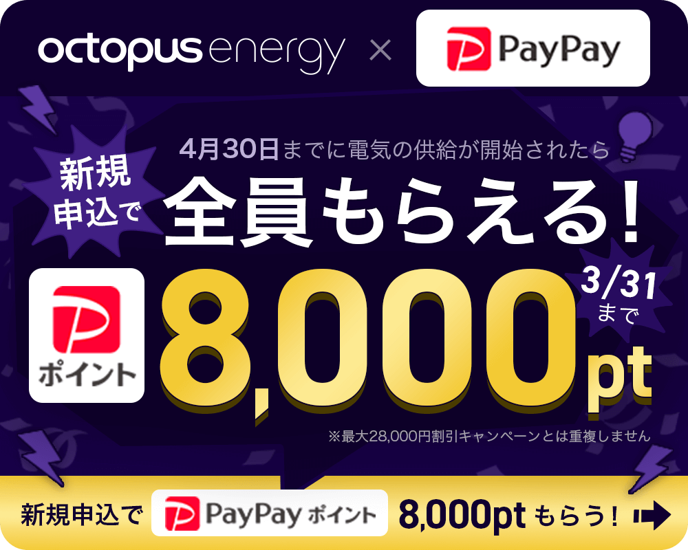 クレジットカード、口座振替、コンビニ払い | 【最大28,000円の電気代割引キャンペーン!】新規申込でもれなく全員8,000円割引 + 抽選で100名様に20,000円割引が当たる! |