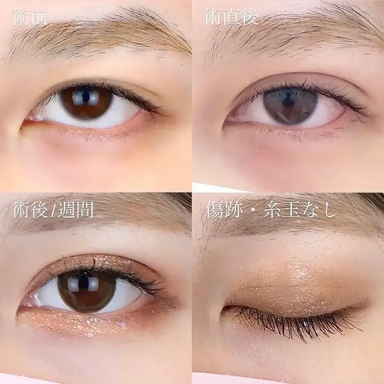 P-PLという線留め埋没法でお願いしました。術直後〜腫れは予想より軽くあまり目立たず良かったです。周りにも気づかれないほどでしたので安心できます。麻酔が痛くなさすぎてびっくりしました。手術翌日は起床時に腫れぼったい感じがしたので10分ほど冷やしてみました。そのせいか腫れはほとんど気になりませんでした。