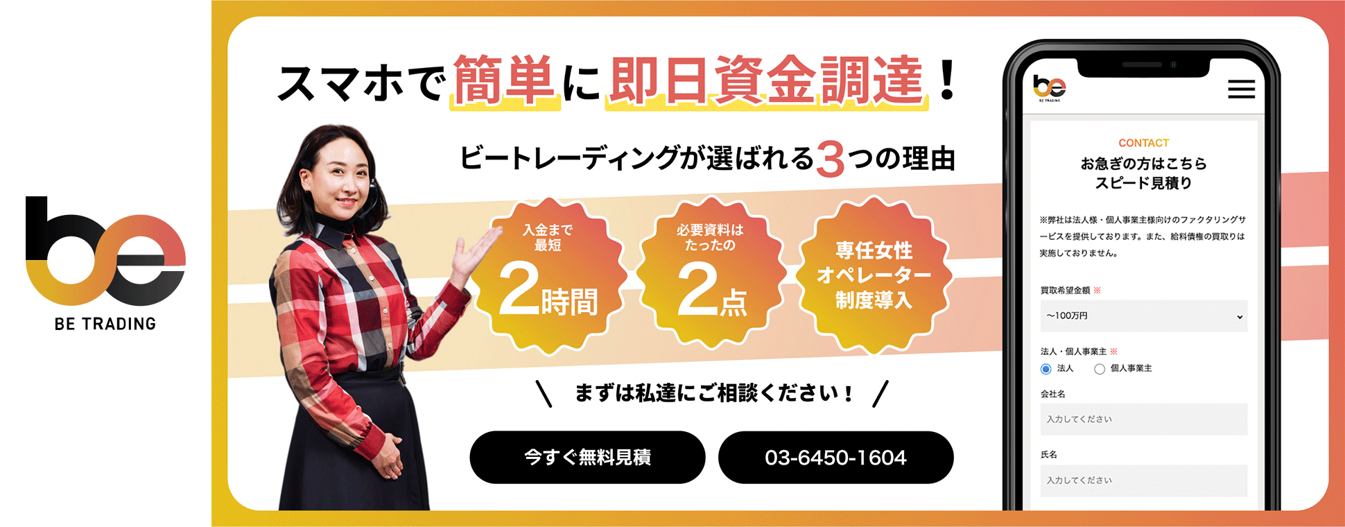 ファクタリングとは、法人・個人事業主の売掛債権(請求書)を買い取ることで期日よりも早く現金を手にできる資金調達方法です。