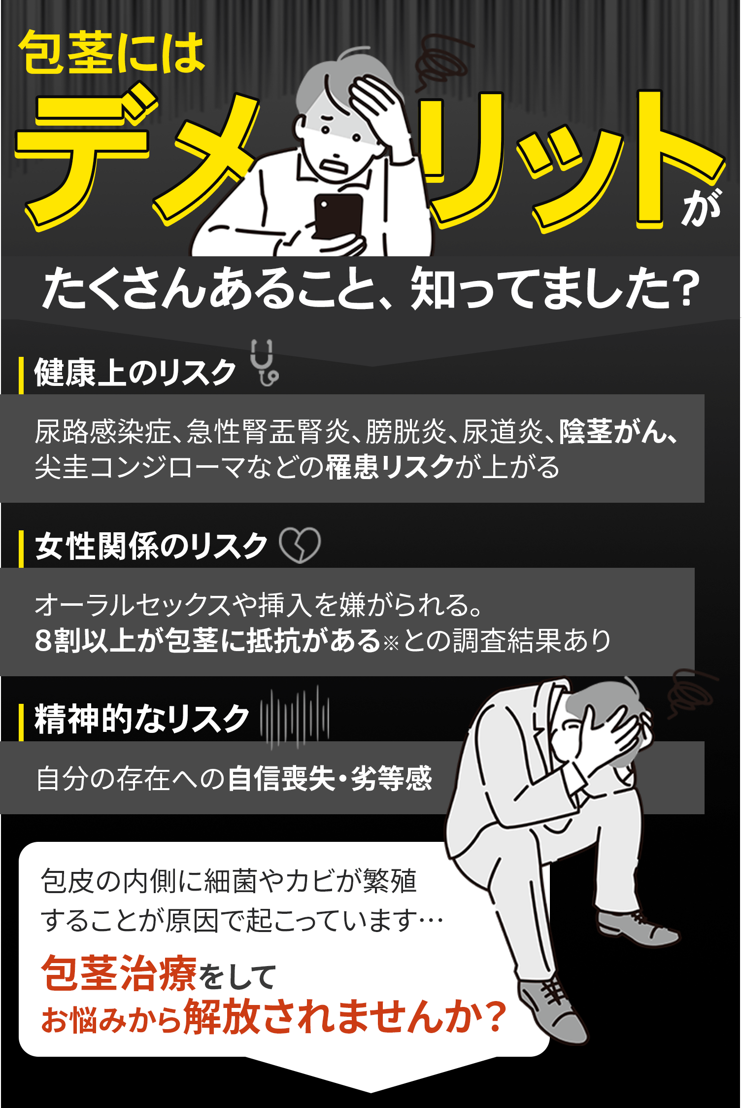 包茎にはデメリットがたくさんあるって知ってました?健康上のリスク:尿路感染症・急性腎盂腎炎・膀胱炎・尿道炎・陰茎がん・尖圭コンジローマなどの罹患リスクが上がる、女性関係のリスク:オーラルセックスや挿入を嫌がられる・8割以上が包茎に抵抗がある、精神的なリスク:自分の存在への自信喪失・劣等感。