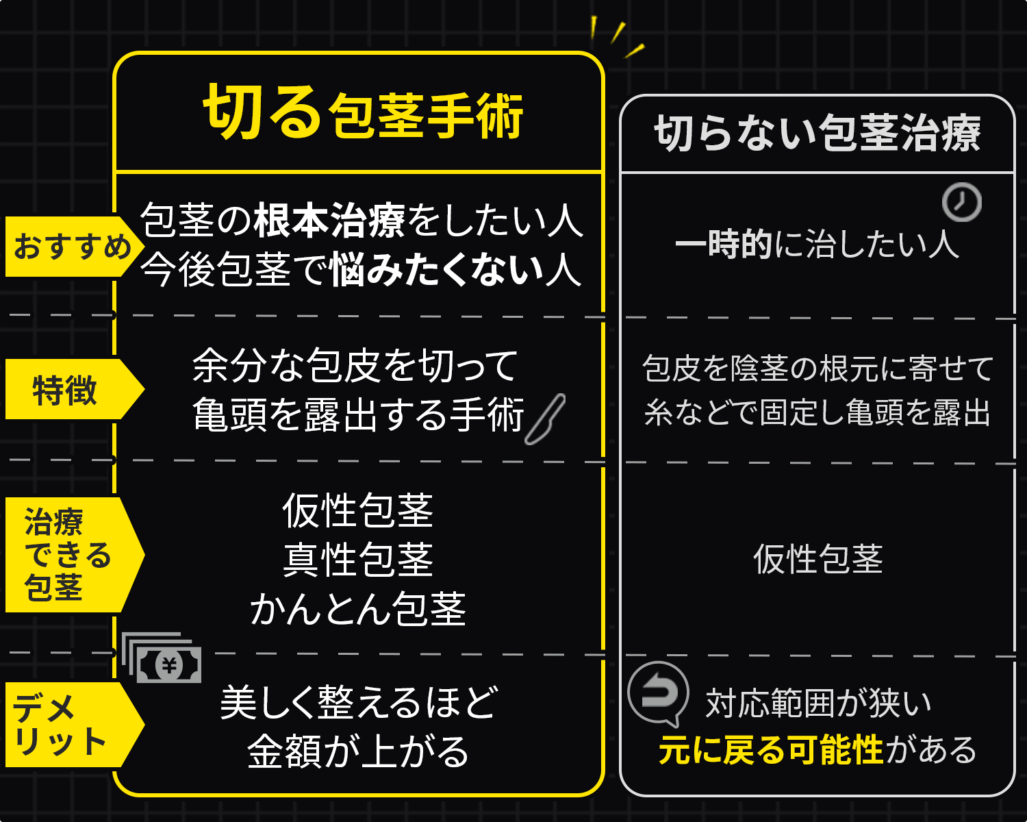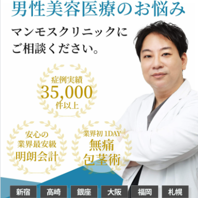 包茎手術は医師の技量に大きく左右される治療法です。実績豊富な医師が在籍するクリニックを選ぶと失敗のリスクが大幅に軽減し、1日で手術が終わります。何度も通い治療費を払い続ける必要もありません。