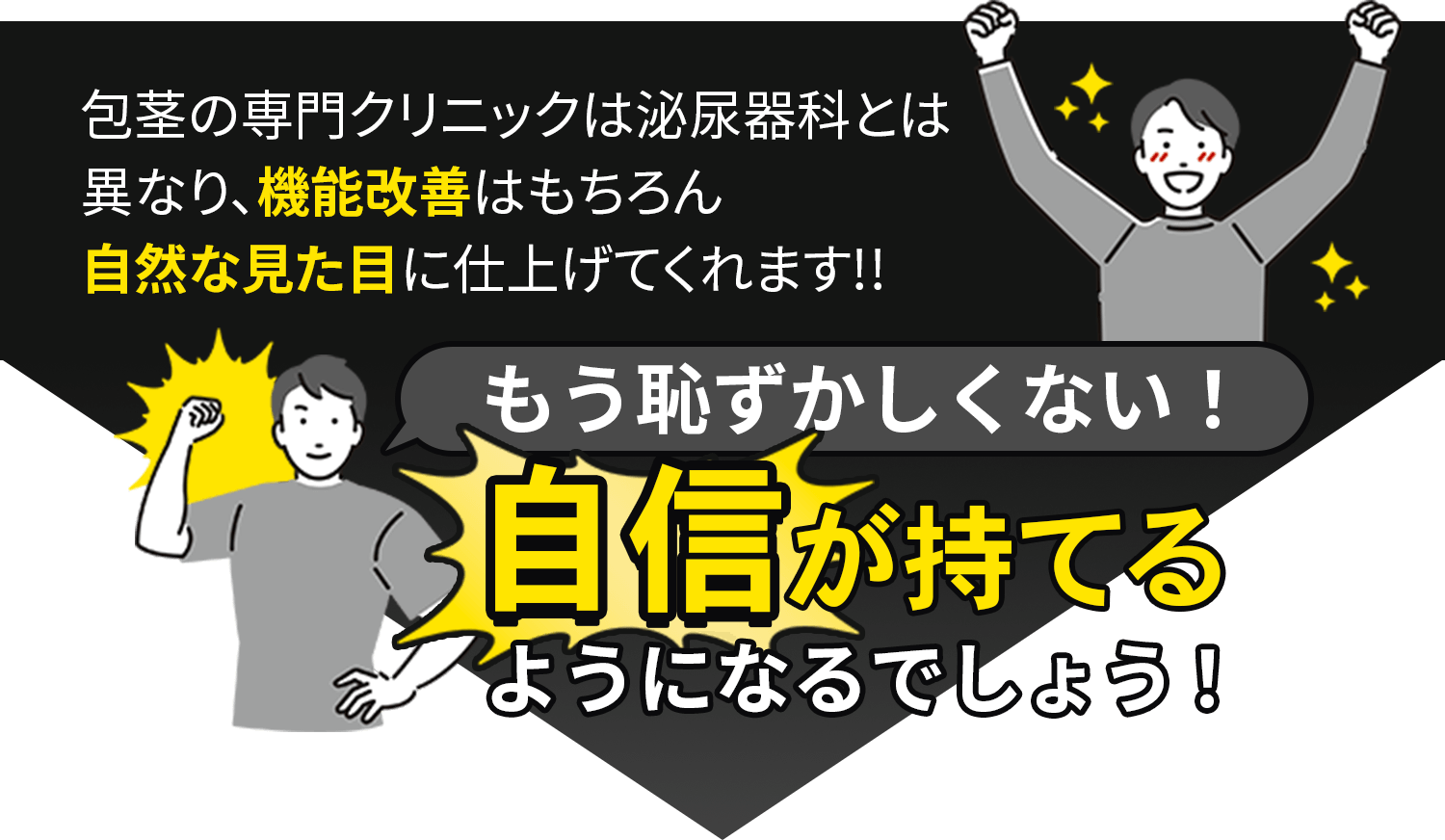 包茎クリニックは泌尿器科とは異なり、機能改善に加えて自然な見た目に仕上げてくれます。もう恥ずかしくない!自信を持てるようになるでしょう!