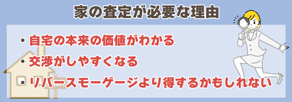 リバースモーゲージの融資限度額は、売却した場合の40%~60%程度が相場ですが、自宅の売却価格を知らなければ融資額が適正かどうかもわからないですよね。