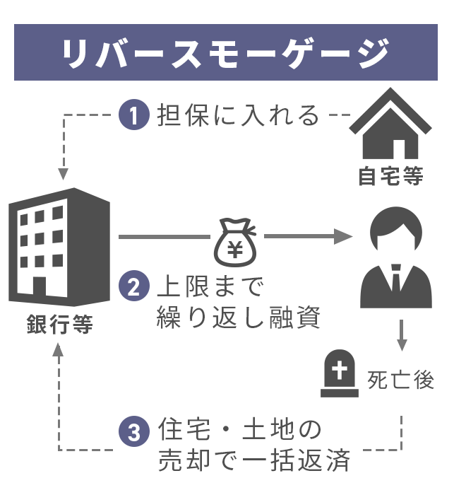 リバースモーゲージとは、今お住まいの自宅を担保に生活資金等を借入して、契約者が亡くなった際に担保不動産を売却などにより一括返済するミドル~シニア向けのローンです。