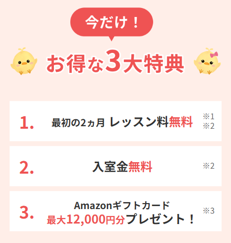 ※3 体験レッスン受講後にお友だちを紹介すると、「紹介した方」へAmazonギフトカード5,000円をプレゼント。