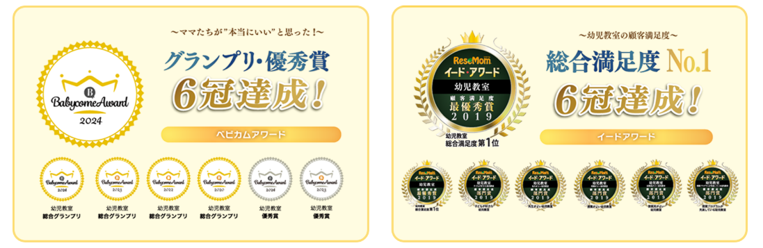 幼児教室を選ぶ際に重要なのが実績があるかどうかですが、ベビーパークでは幼児教室部門で多数の受賞実績があります!