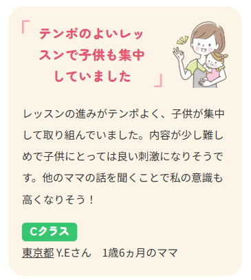 クラス分けも0歳~3歳までA~Eクラスと細かく別れており月齢に最適なレッスンを受けることができます!