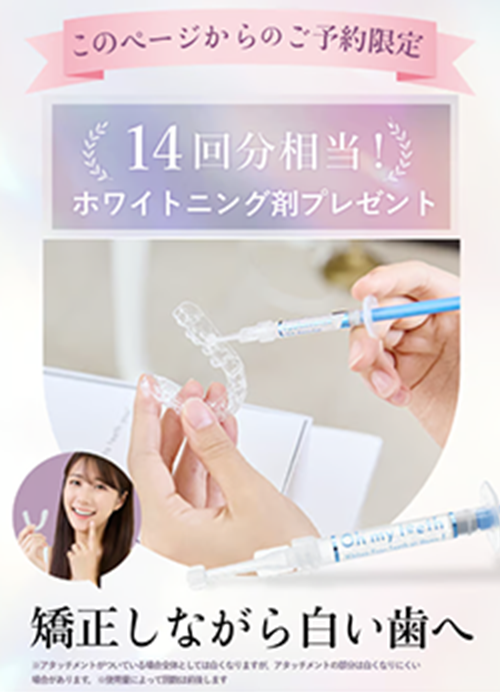 矯正開始後の定期通院不要! ここからのご予約でホワイトニング剤1ヶ月分相当プレゼント! |