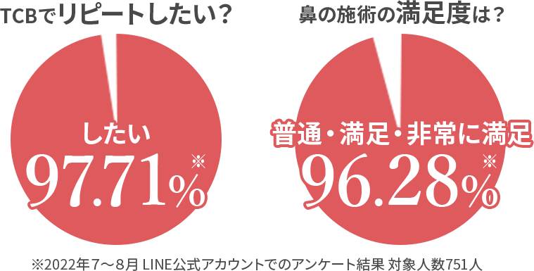 鼻の構造は複雑なため、適切な施術と優れた技術がなければ理想の鼻のデザインを実現できません。TCBには手術歴10年以上のドクターが多数在籍しており、その技術力の高さはアンケートでも実証されています。