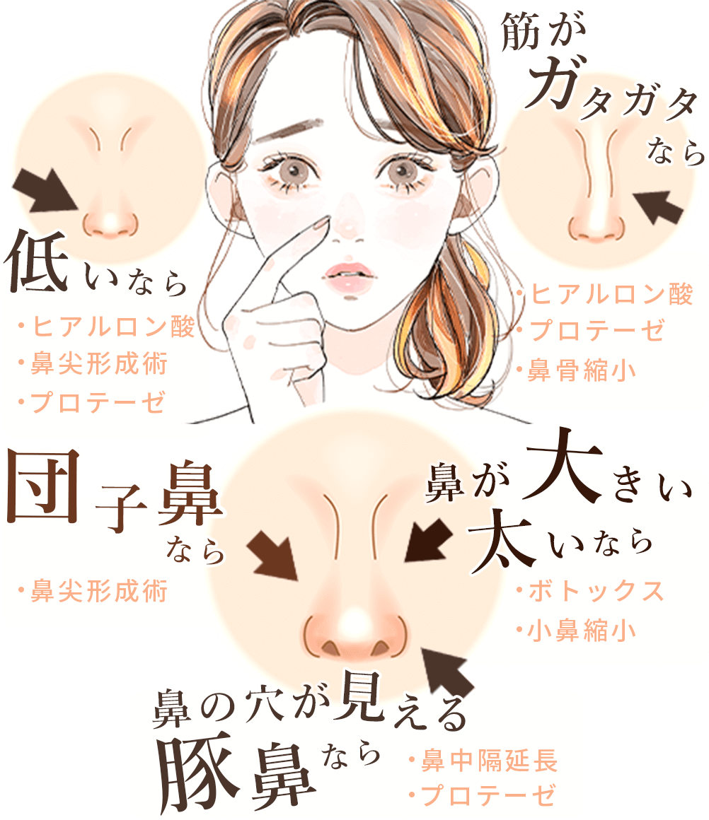 鼻整形は繊細な手技と美的センスが求められ、美容整形の中でも最も難しい施術のひとつだといわれています。1種類の施術だけで理想の鼻をデザインするのは難しく、複合的な施術が必要になる場合があります。