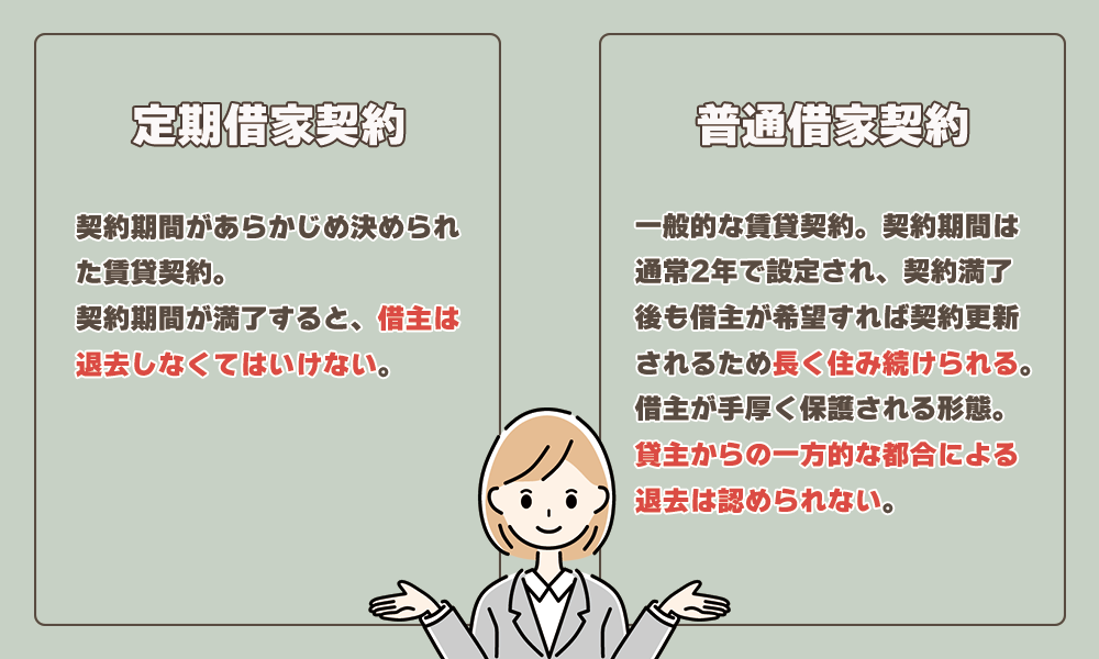 賃貸物件の契約形態には、貸主側の都合で契約期間を決められる「定期借家契約」と、借主が希望する限り住み続けられる「普通借家契約」があります。