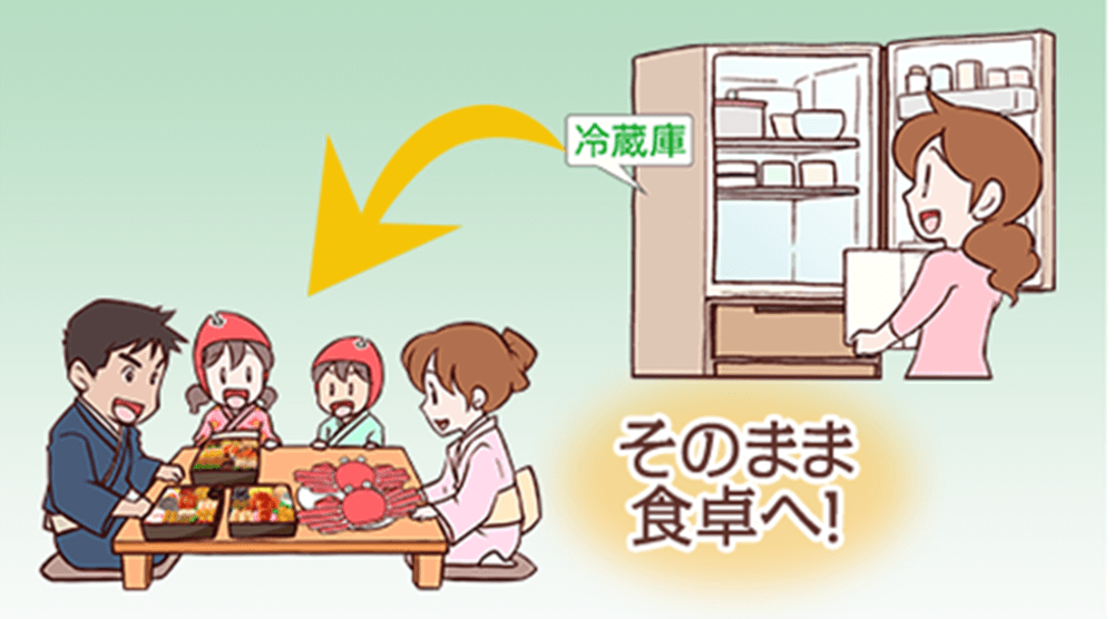 また冷蔵の生おせちは解凍の必要がないので冷蔵庫で保管してそのまま食卓へ出せるので