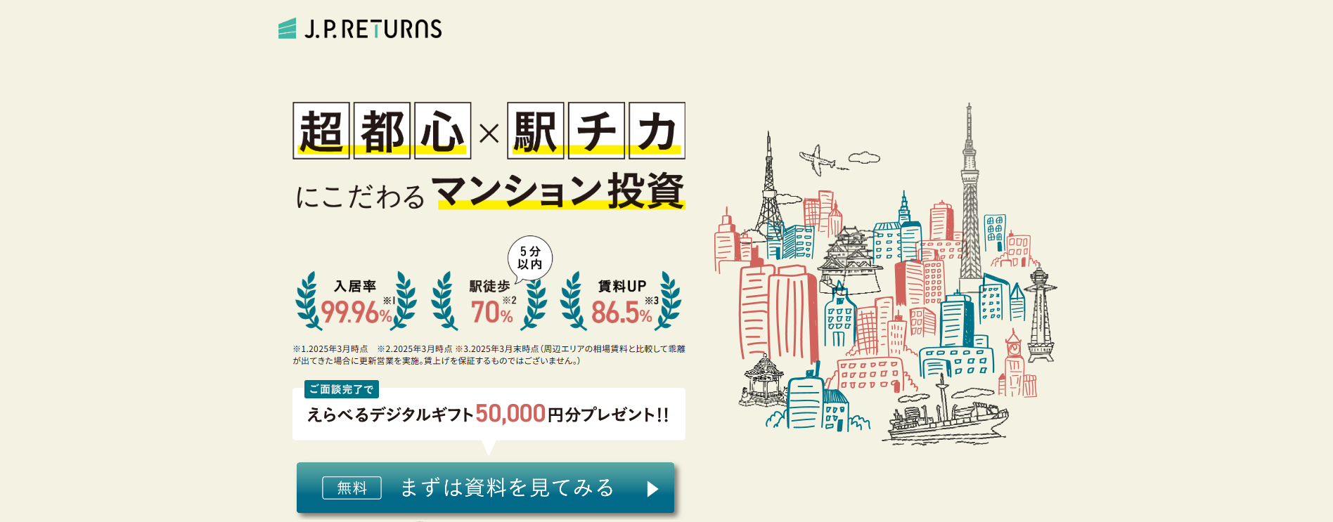 | 東京都心エリア/川崎/横浜/大阪/神戸/京都/福岡 | 中古区分マンション | 99.96% 2025年3月末時点 |
