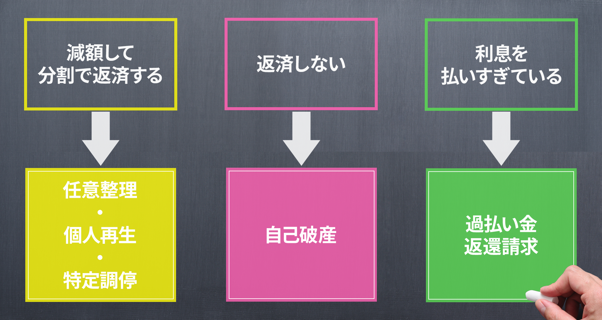 | 任意整理 | 「将来利息のカット」や「返済期間の延長」を裁判所を通さず交渉する手続き |