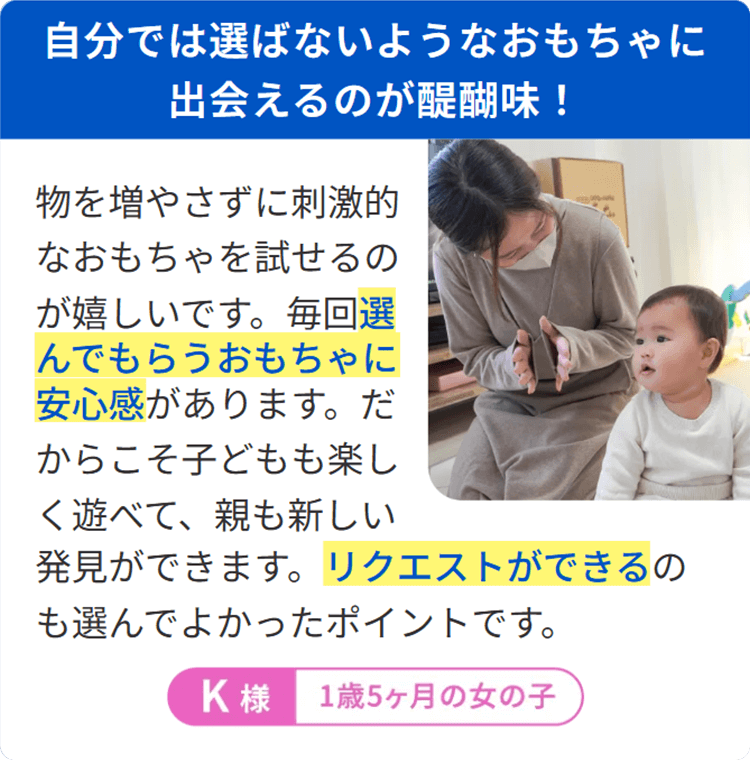 膨大なデータをもとに一人ひとりに合わせて知育のプロがおもちゃを選定。 好みに偏らず新しい発見ができます! カタログからリクエストすることもできるので お子さまの好きも新しい発見も両方、大切にすることができます!