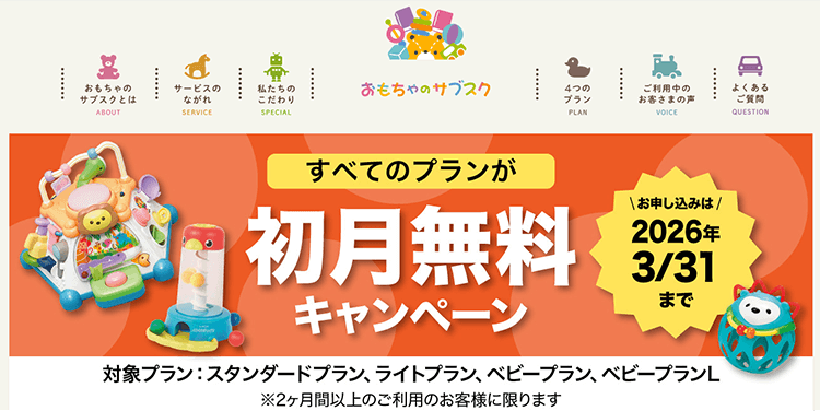 | 月額3,198円(税込)~ | 2ヶ月以上の利用で 初月無料キャンペーン中 成長に合った知育玩具と絵本が届く | 6点 |