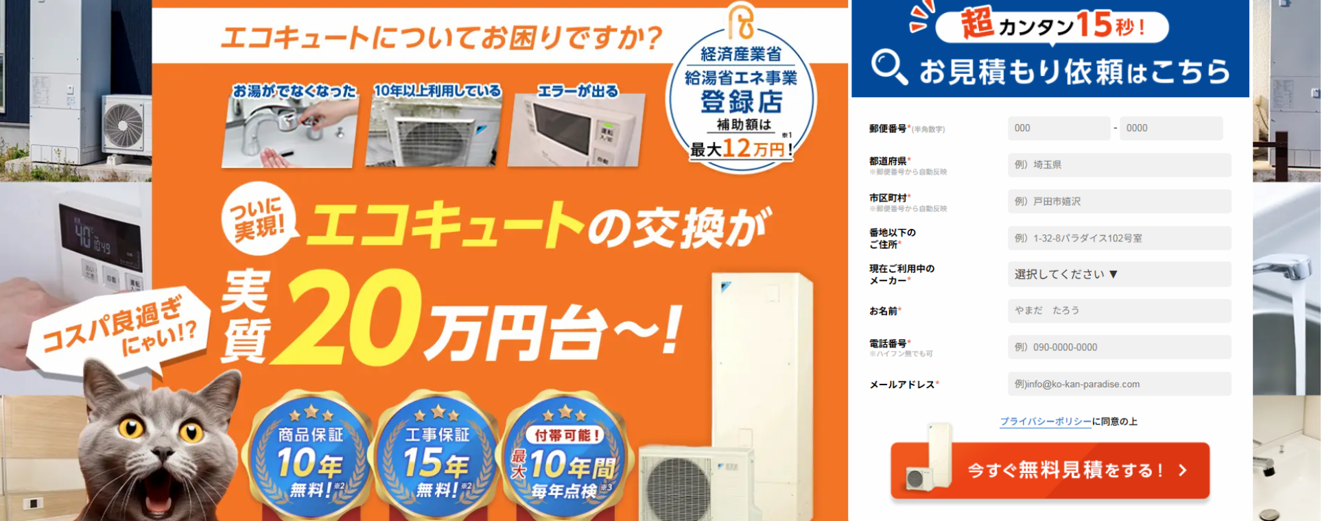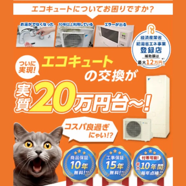 エコキュートの故障、交換でお願いしましたが、電話をした翌日に取り付に来てくれて、前の機器の撤去がかなりやっかいでしたが、ちゃんと対応してくれて良かったです。 他の業者もあたっていたのですが、1週間〜3ケ月待ちだったり、金額が高かったりで、お願いできる状況でなかったので、助かりました。 金額も電話口て話した金額のままで、何よりカード払いて、分割やボーナス払いができたのが良かったです。