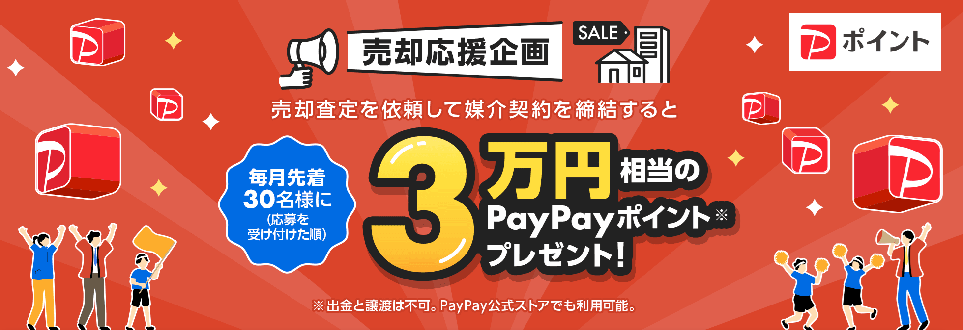 ヤフー不動産で売却査定を依頼して媒介契約を締結した方、毎月先着30名に3万円相当のPayPayポイントがもらえます。(※その他条件はヤフー不動産のサイトでご確認ください。)